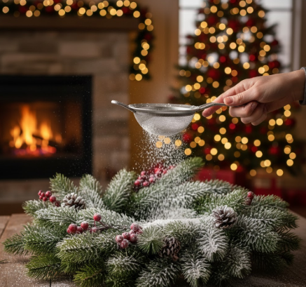 Apply flocking powder to garlands, wreaths, or fake snow around your windows.