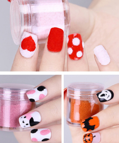 4.Dust on the Flocking Powder: While the adhesive is still wet, sprinkle the velvet flocking powder generously over your nails.